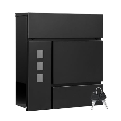 WOLTU Brevlåda med tidningsfack, postlåda med lås, 2 nycklar, låsbar väggbrevlåda med gångjärnslock, modern, svart, 37 x 37 x 10,5 cm