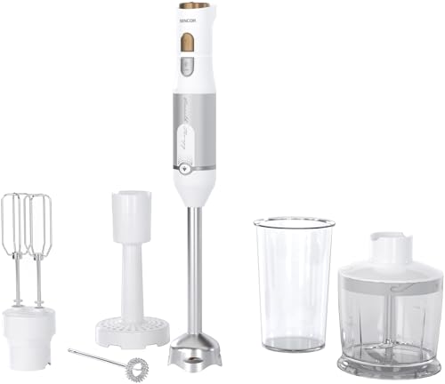 Sencor Ultrakraftfull multifunktionell dykblandare, 6-i-1, 1 200 W, med dubbel visp, chopper och skummare, potatismosare, QuadBlade-blad i titan, kontinuerlig hastighetskontroll, elegant design - vit