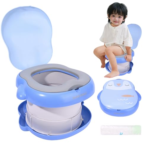 GUHAOOL Toalettsits barn, potta för på resande fot 3-I-1 resepotta hopfällbar barn med 40 pottpåsar, anti-halk design potträningssitsar potträningssits för baby (blå)