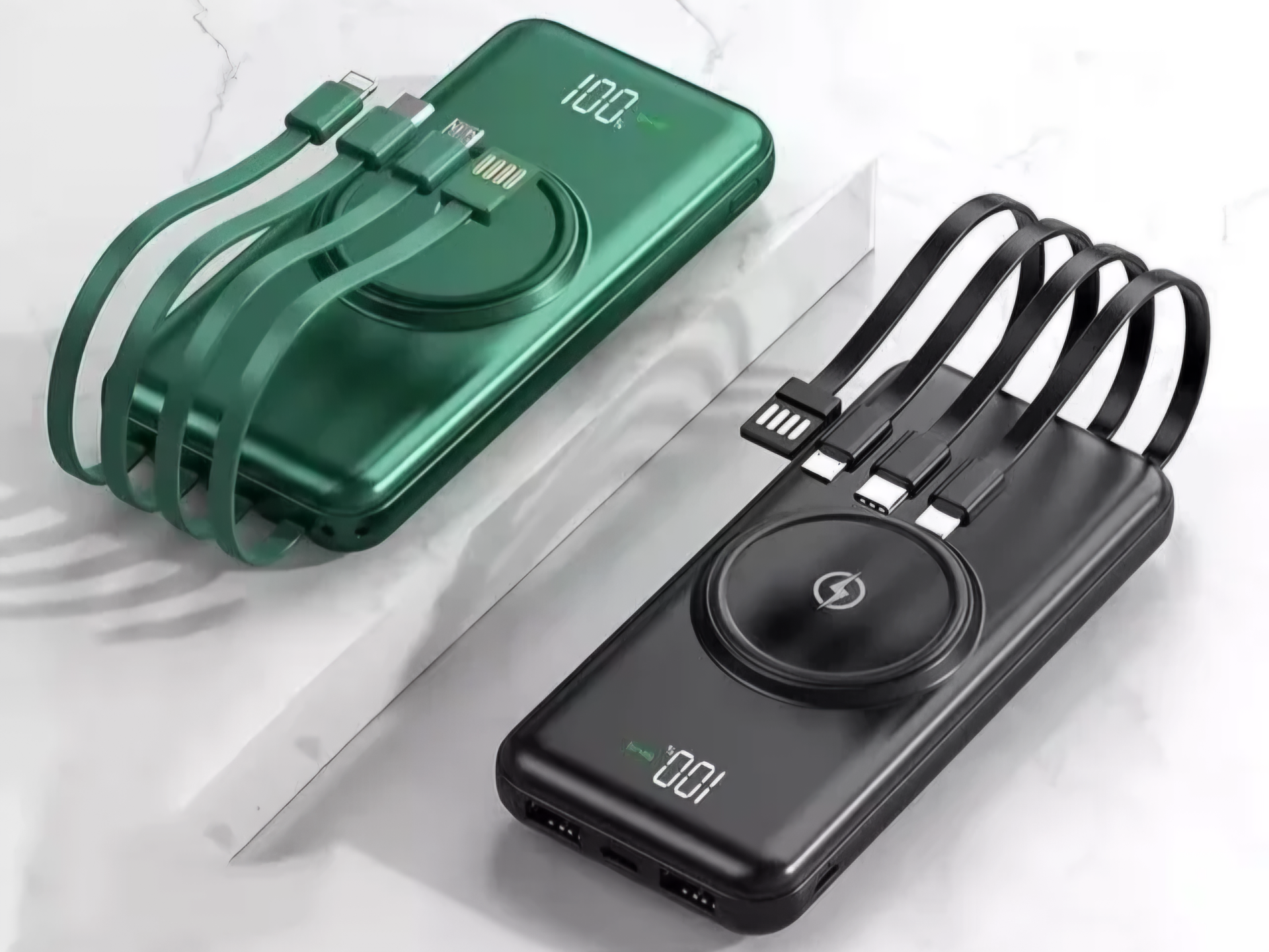 Powerbank 15000 mAh trådlös laddning & inbyggda kablar (iphone, android, usb in/ut m.fl.), Färg: Grön