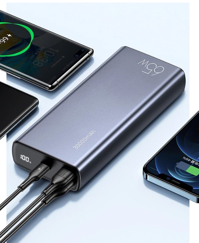 Powerbank 65WPRO för smartphone och bärbara datorer, 30000mAh, Quickcharge, 1 USB-C, 2 USB-A