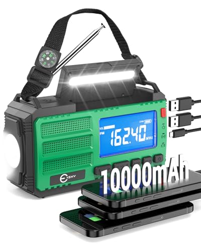 Esky Solradio 10000mAh, bärbar nödradio med AM/FM/NOAA vev med Powerbank, LED-ficklampa, lä, SOS och kompass, USB-uppladdningsbar, sol- eller vev för camping och avstängning