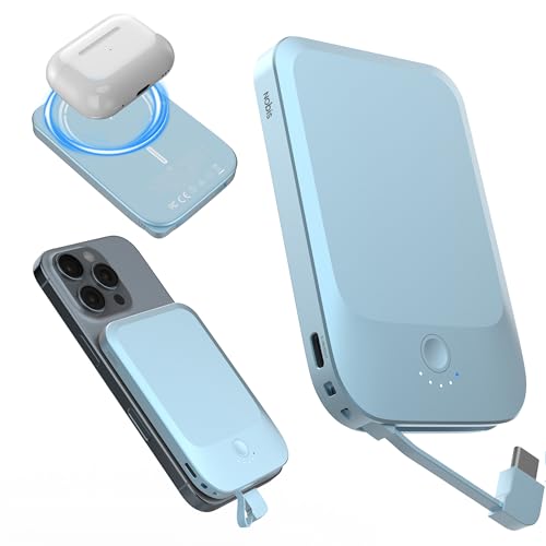 Nobis Slim Magnetisk Powerbank 5000mAh med Inbyggd Kabel, Portabel Batteribank med Snabbladdning QC 3.0 22.5W PD, USB C In/Ut,för MagSafe 15W Trådlös Powerbank för iPhone 16, Samsung, Android (Blå)