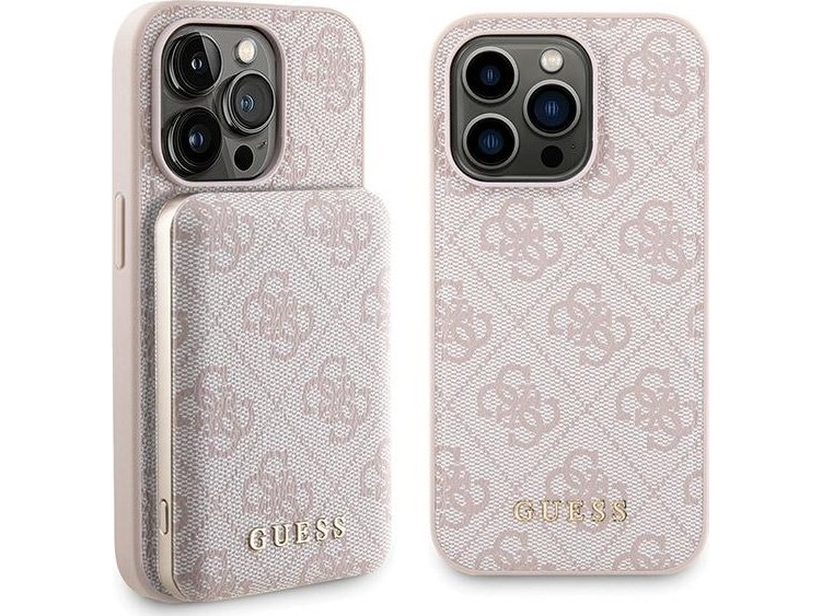 Guess 4G Metall Logo fodral set för iPhone 14 Pro + 5000mAh MagSafe powerbank - rosa