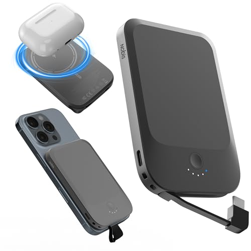 Nobis Slim Magnetisk Powerbank 5000mAh med Inbyggd Kabel, Portabel Batteribank med Snabbladdning QC 3.0 22.5W PD, USB C In/Ut,för MagSafe 15W Trådlös Powerbank för iPhone 16, Samsung, Android (Svart)