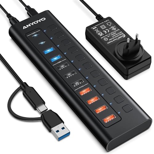 USB C Hub Aktiv, ANYOYO 48 W USB-hub aktiv 3,0 med strömförsörjning, Powered USB-hub med 4 laddningsportar, USB-hubb aktiv med 5 Gps USB C 3.0, USB A 3.0, USB A 2.0, USB-hubb med strömförsörjning för