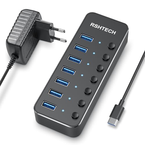 RSH-518C USB-hub, USB 3.0, strömförsörjning RSHTECH till 7 portar, USB 3.0, SuperSpeed Port, datafördelare, med 5 V/2 A strömförsörjning och individuella omkopplare för bärbar dator och PC, Powered
