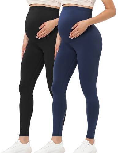 POSHDIVAH Women's Maternity Leggings Over The Belly Pregnancy Yoga Pants Active Wear Workout Leggings 2pcs Black Large