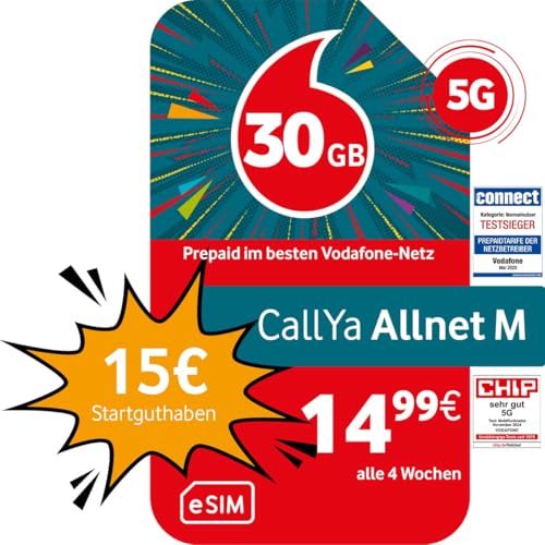 Vodafone Prepaid CallYa M eSIM | 30 GB | 15 EUR startkredit | utan kontrakt | 5G-nät | Telefon SMS-Flat | EU-Roaming