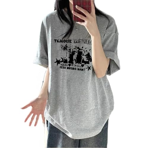 Kvinnor vintage t-shirt Y2K katt grafisk Harajuku t-shirt toppar sommar emo grunge överdimensionerade streetwear preppy gotiska kläder, Grå, XL