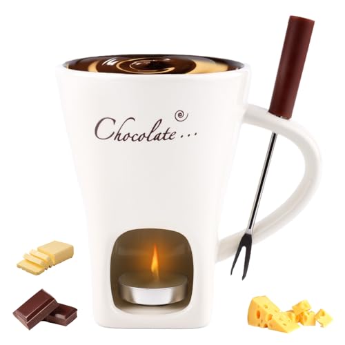 Gosknor Chokladfondue-Mugg med Gaffel, Söt Smältkopp med Tändvätskelyktor för Choklad Ost Desserter Keramiskt Fondue-Set Perfekt Present för Romantiska Kvällar Födelsedagar Jubileer Bröllop (Vit)