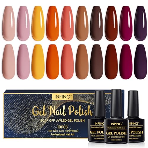 Inping UV-gelnagellack, höst- och vintergelnagellack i 10 färger, mörk, hudfärg, orange, gul, korall, magenta, choklad, brun, lägereld, gelnaglar för blötläggning, present