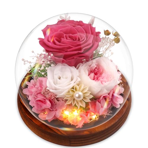 Alla hjärtans dag-present till din mamma, mormor, rosa blomma, present till henne, 3 rosa sidenros med LED-ljus i en glaskupol, för mors dag, födelsedag, årsdag, rosa blomma