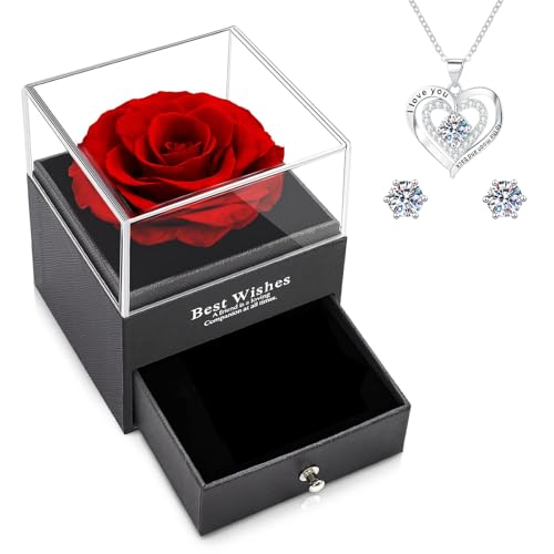 NEWUPZSI Julpresenter, till mors dag, evig äkta ros, röd konserverad ros, presentförpackning med halsband och örhängen, äkta ros, blomma, present till mödrar, mamma, ros till mors dag, henne