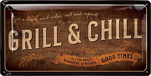 LANOLU Retro plåtskyltar grillning – GRILL AND CHILL LOUNGE – BBQ grill retro dekoration – grillplats skylt trädgård – present till pappa grillhörnskylt, 17 x 34 cm