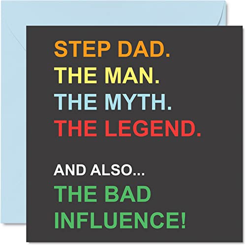 Roliga farsdagskort för styvpappa – mytlegenden med dålig inflytande – skämt grattis på födelsedagskort till styvpappa från son dotter, skämtgåvor, 145 mm x 145 mm farsgratulationskort present till pappa