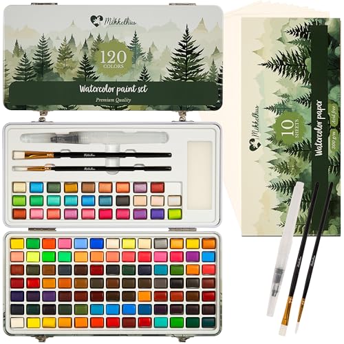 Mikkelhus Set med 120 akvarellmålningar i en låda med pensel och papper | Högkvalitativa akvarellmålningssatser för konstnärer, nybörjare och barn, presentförpackning
