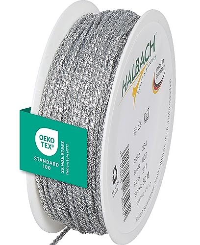 Halbach Seidenbänder Premium snöre silver | bredd: 2 mm längd: 50 m | snöre 2 mm för dekorationer | silversnöre för gör-det-själv-hantverk och presentförpackningar, färg: silver