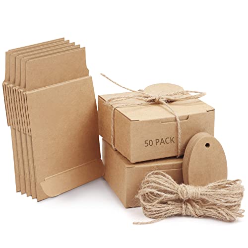 Belle Vous Bruna Fyrkantiga Presentförpackningar i Kartong med Lock, Snöre och Etiketter (50-Pack 7,5 cm x 7,5 cm x 3,5 cm - Små -Lådor för DIY Bröllops- och Festpresenter och Andra Tillfällen