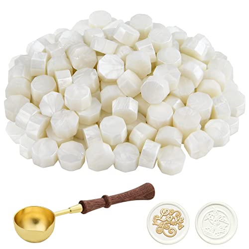 Astaron Sigillvax, 100 stycken, vit, sigillvaxpärlor med 1 vaxsmältsked, åttkantigt vaxsigillset för inbjudningar, kort, kuvert, vinpaket, presentförpackningar