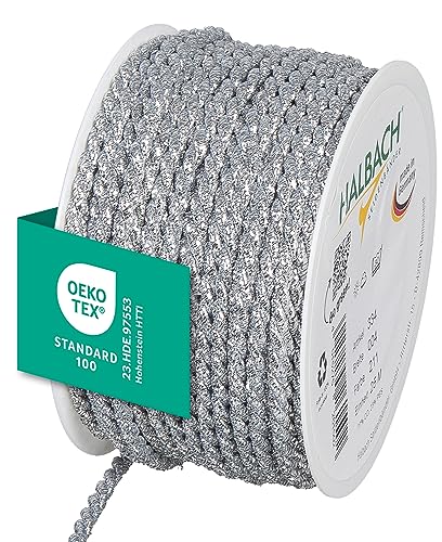 Halbach Seidenbänder Premium snöre silver | bredd: 6 mm längd: 25 m | snöre 2 mm för dekorationer | silversnöre för gör-det-själv-hantverk och presentförpackningar, färg: silver
