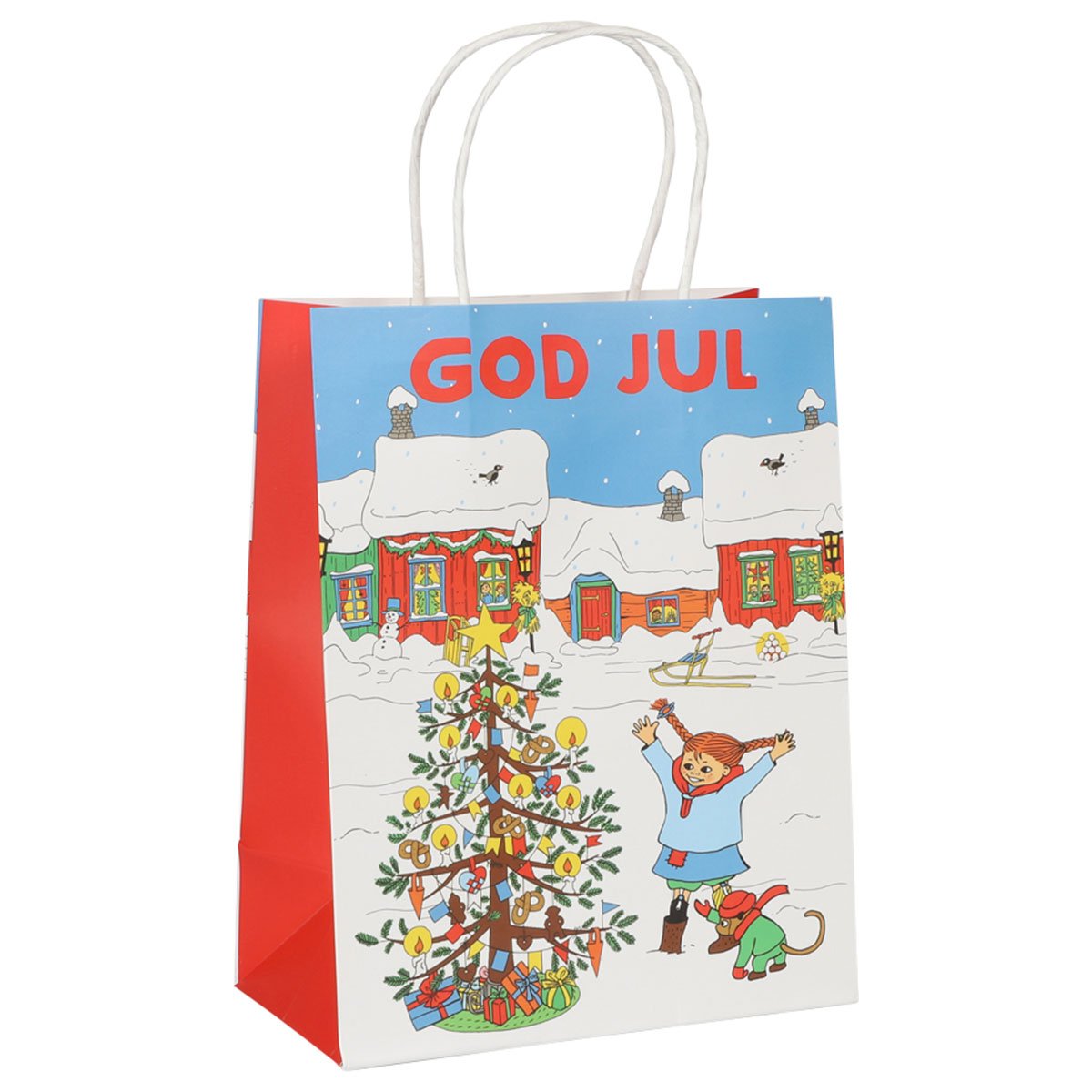 Jul medium presentväska, presentpåse medium till jul, julklapp inslagningsväska, rödhake julklappsväska, vit och röd julklappspåse