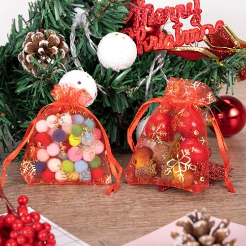 Presentpåsar 100 stycken organza-påsar röd 10 x 15 cm till jul – liten presentpåse med dragsko och snöflinga