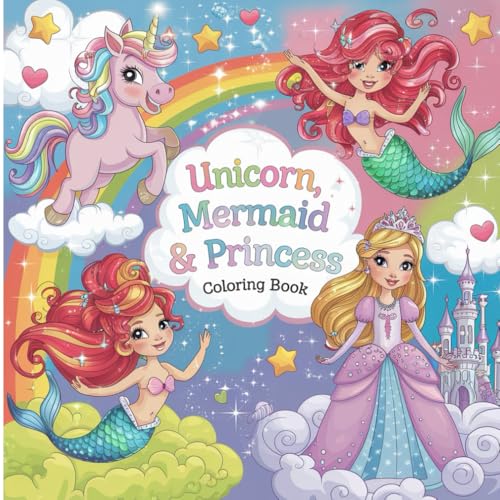 Unicorn, Mermaid & Princess Coloring Book for Kids Ages 4-8: – 50 Fun and Magical Coloring Pages of Cute Unicorns, Beautiful Mermaids, and Pretty Princesses for Girls and Boys
