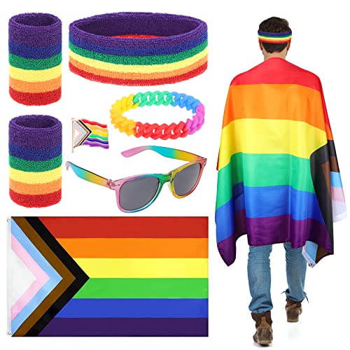 PHOGARY Pride Flagga Cape-set, 6 stycken HBTQ lesbiska gay pride tillbehör inklusive pride flagga regnbåge pannband armband solglasögon armband pride märke för pride parade gay pride festivaler,