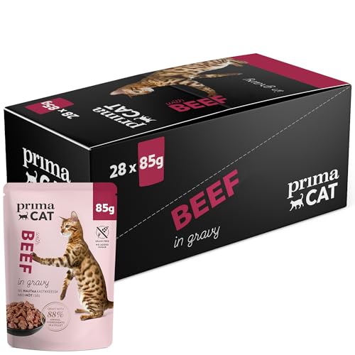 PrimaCat – klassiskt våtfoder för katter, smaker nötkött i steksås, 28-pack med 85 g vardera