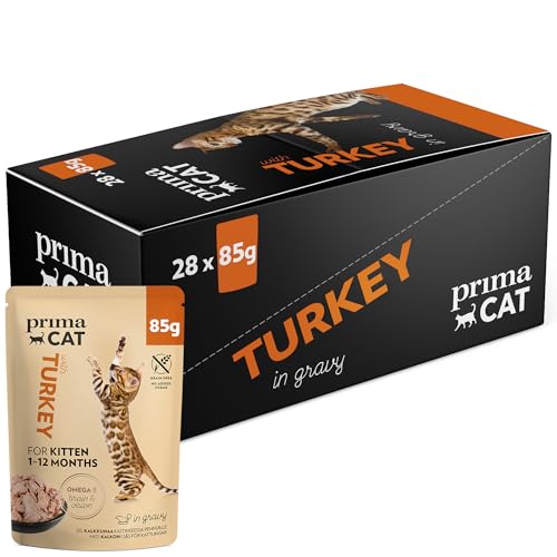 PrimaCat – klassiskt våtfoder för kattungar, smaker kalkon i steksås, 28-pack med 85 g vardera