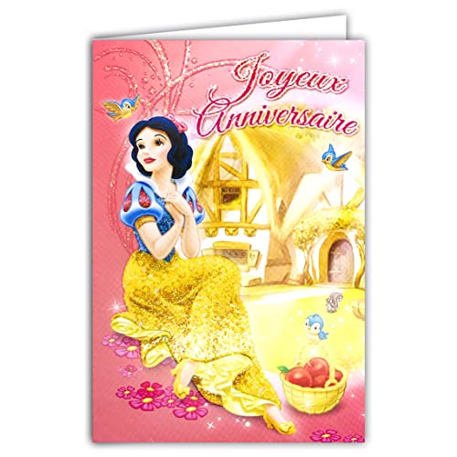 DISNEY PRINCESS kort Grattis på födelsedagen klänning med grattis på födelsedagen gult kuvert snövit och 7 dvärgar musiker kanin röda äpplen varma hus fåglar illustration flicka barn 130926