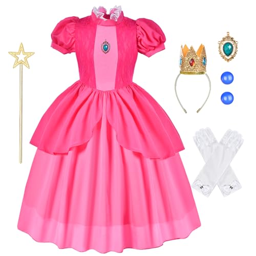 Aomig Princess kostym för flicka, 6 st Pink Princess Dress Up med kronörhängen Handskar Brosch & Wand, Pink Princess Outfit, Kids Princess Klänning för Cosplay Halloween