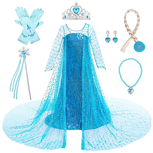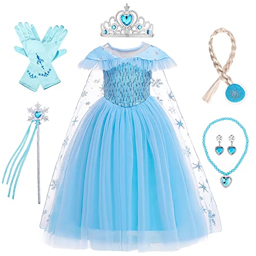 LOBTY Flicka Elsa Princess Klänning, Snö drottning Kostym, Prinsessklänning, Princess Accessory, Födelsedag, Fest, Jul, Halloween, Karneval, Cosplay, Barn, Blå