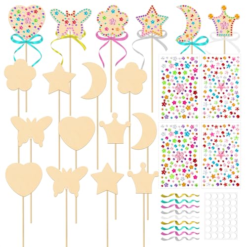OPUHOHR Set med 18 träälvstavar hantverksprojektsatser, prinsess-sago-kit med ädelstensklistermärken, band obehandlat trä gör-det-själv trollstav, gör-det-själv-hantverk konstprojekt gåvor för flickor