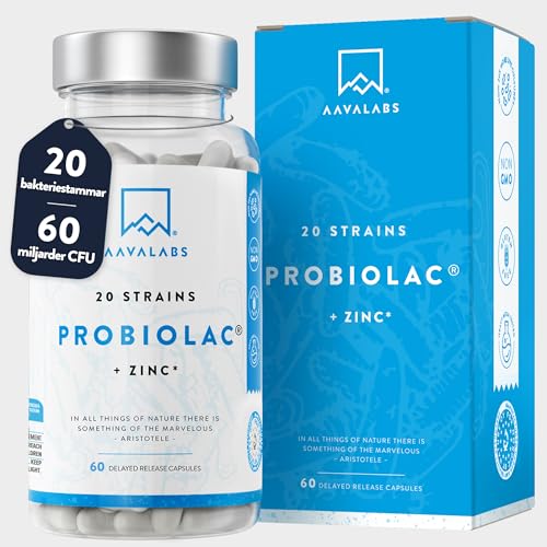 Kulturkomplex [60 miljarder KBE ] per daglig dos – 20 bakteriestammar inklusive acidophilus, Lactobacillus, bifidobakterium + zink (för immunsystem) – laboretestestad – 60 kapslar