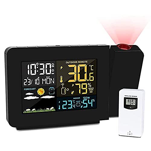 Uzoli EM3211A Projection alarm clock with LED display, 8h Weather forecast, Temperature & Humidity – 2 Alarms, Snooze function, 180° Rotatable projection, 10 Ringtones, ideal for home or office