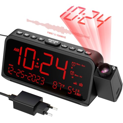Radioväckarklocka med projektion, projektionsväckarklocka för sovrum, typ C och USB-port, veckodag/helg, projektionsklocka DST dimmer/temperatur/datumvisning, väckarklocka digital för nattduksbord