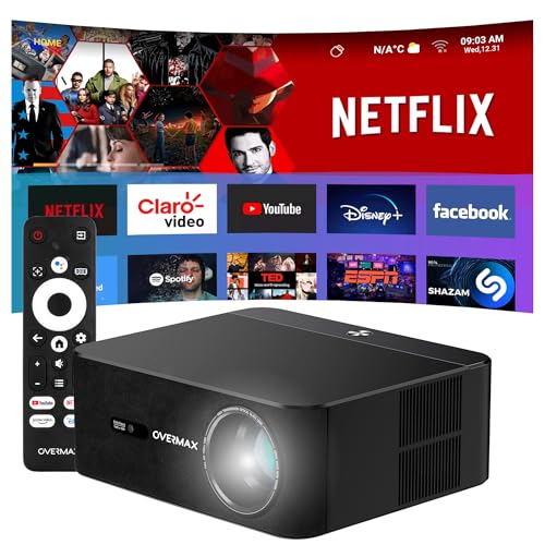 Overmax Multipic 5.2 Smart Projektor – 4K-stöd & Full HD 1080P, Google TV med röststyrning, WiFi/Bluetooth/Miracast, Auto Keystone, 200″ hemmabio, 7000 lumen, Kompatibel med Smartphone/HDMI/USB/PS5