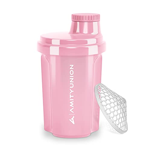 AMITYUNION Protein Shaker 300 ml "Heaven" läckagesäker, BPA-fri med klickbar sil och skala för krämiga vassshakes, gym fitnesskugg för isolat och sportkoncentrat, proteinshaker, korallrosa