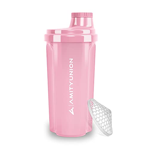 AMITYUNION Protein Shaker "Heaven" 500 ml läckagesäker, BPA-fri, med sil och skala - original - för krämiga vassproteinpulvershakes, proteinisolat och BCAA koncentrat, fitness mixer korall rosa