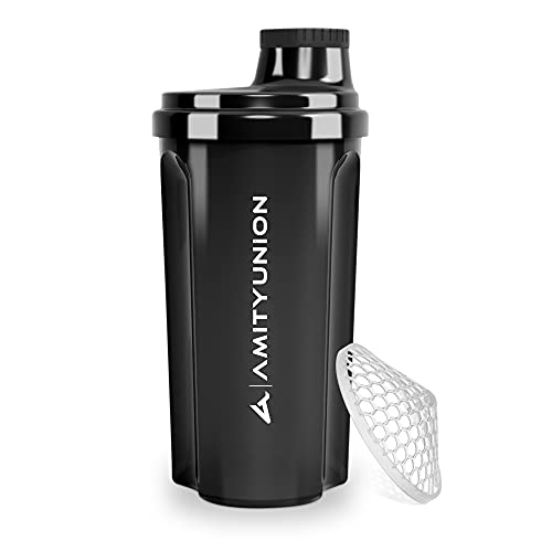 Protein Shaker - The ORIGINAL från AMITYUNION - Läcksäker protein shaker - BPA-fri med sikt, skala för krämiga vassle-shakes, Gym Deluxe-koppar för isolat och sportkoncentrat (Svart Guld)