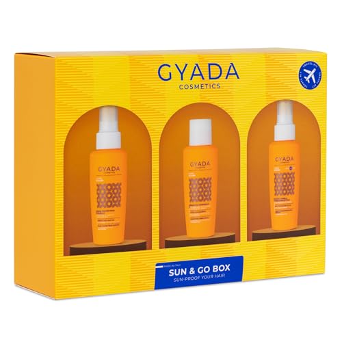 GYADA COSMETICS, SUN & GO BOX Set bestående av schampo, sololja och värmeskyddande vätska SPF10, solskydd, klor, vind och saltlösning, med vegetabiliskt protein, 3 x 100 ml