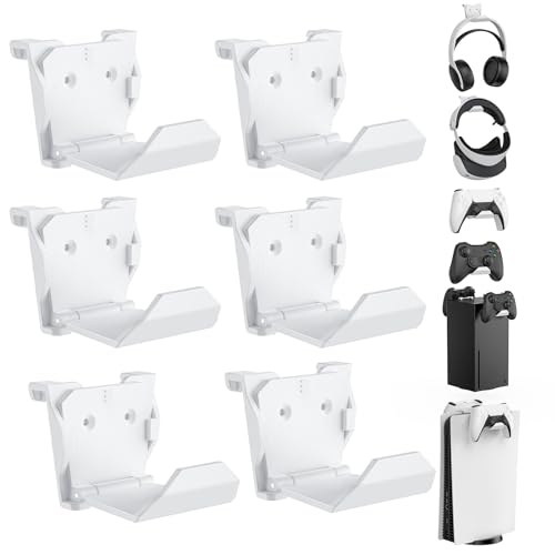 KUNSLUCK Set med 6 väggfästen för PS5-kontroll, Xbox, strömbrytare, väggfäste för styrenhet och headset, självhäftande installation/skruv (vit)