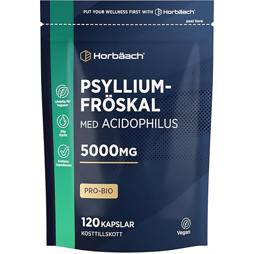 Psyllium Husk 5000 mg Capsules with Acidophilus | 120 Veganska Kapslar | Psylliumskal + Lactobacillus Acidophilus + Pro-Bio | Fiberkomplex | Horbaach