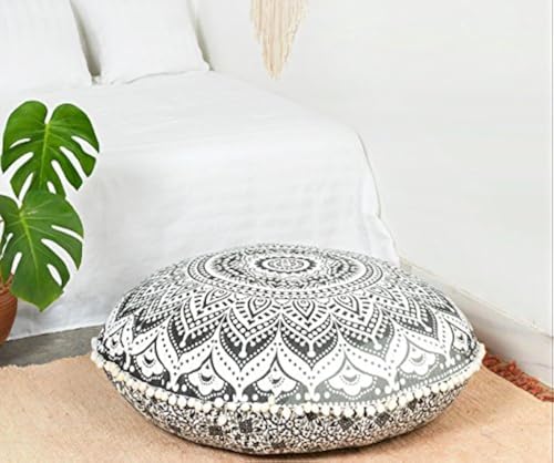 Populärt hantverk golvkudde kuddfodral – hippie mandala kuddöverdrag stor – puffskydd rund bohemisk yogadekor, skärmtryckt design, 81 cm svart grå