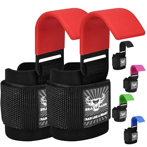 BEAST RAGE Tyngdlyftskrokar Handledsremmar Tjocka neopren vadderade gummibelagda Fitness Wraps Non Slip Pull Up Marklyftsgrepp Träning Träning Gym Träning Män Kvinnor (Red)