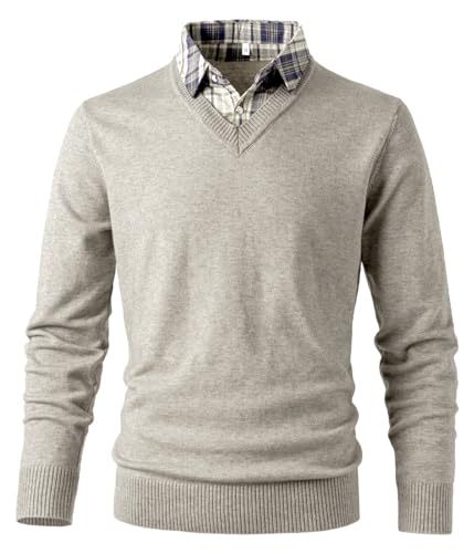 Btmpmcs Män enkel v-hals jumprar vardaglig smal passform stickade pullover tröjor långärmad med falsk skjorta krage infoga stickad tröja skjortor toppar, Khaki, XL