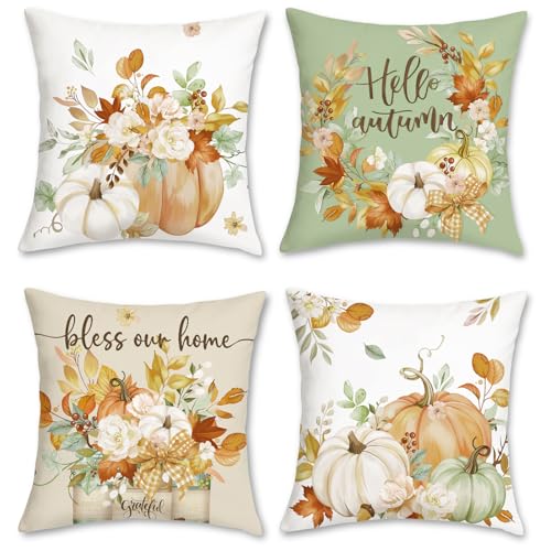 Bonhause Höst pumpa kuddfodral 45 x 45 cm kronblad blommig grön orange sammet dekorativt kuddfodral för soffa vardagsrum sovrum trädgård heminredning 4 delar