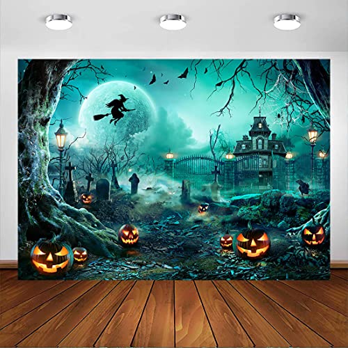 Avezano Halloween fotografi bakgrund hemsk pumpa kyrkogård fullmåne natt bakgrund för barn magisk häxa trollkarl gravsten fest dekor banderoll fotografering bås rekvisita (2,1 x 1,5 m, grön)